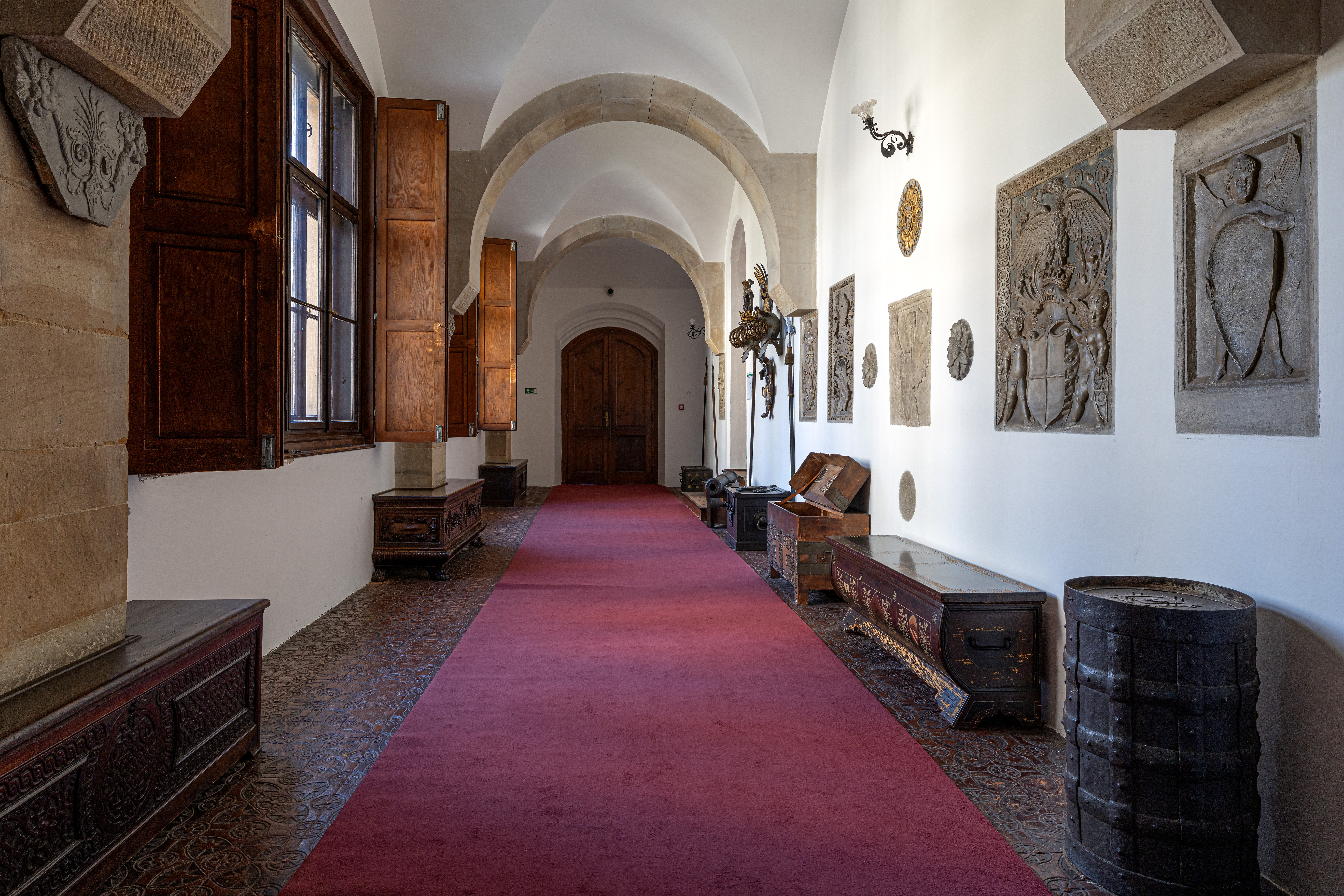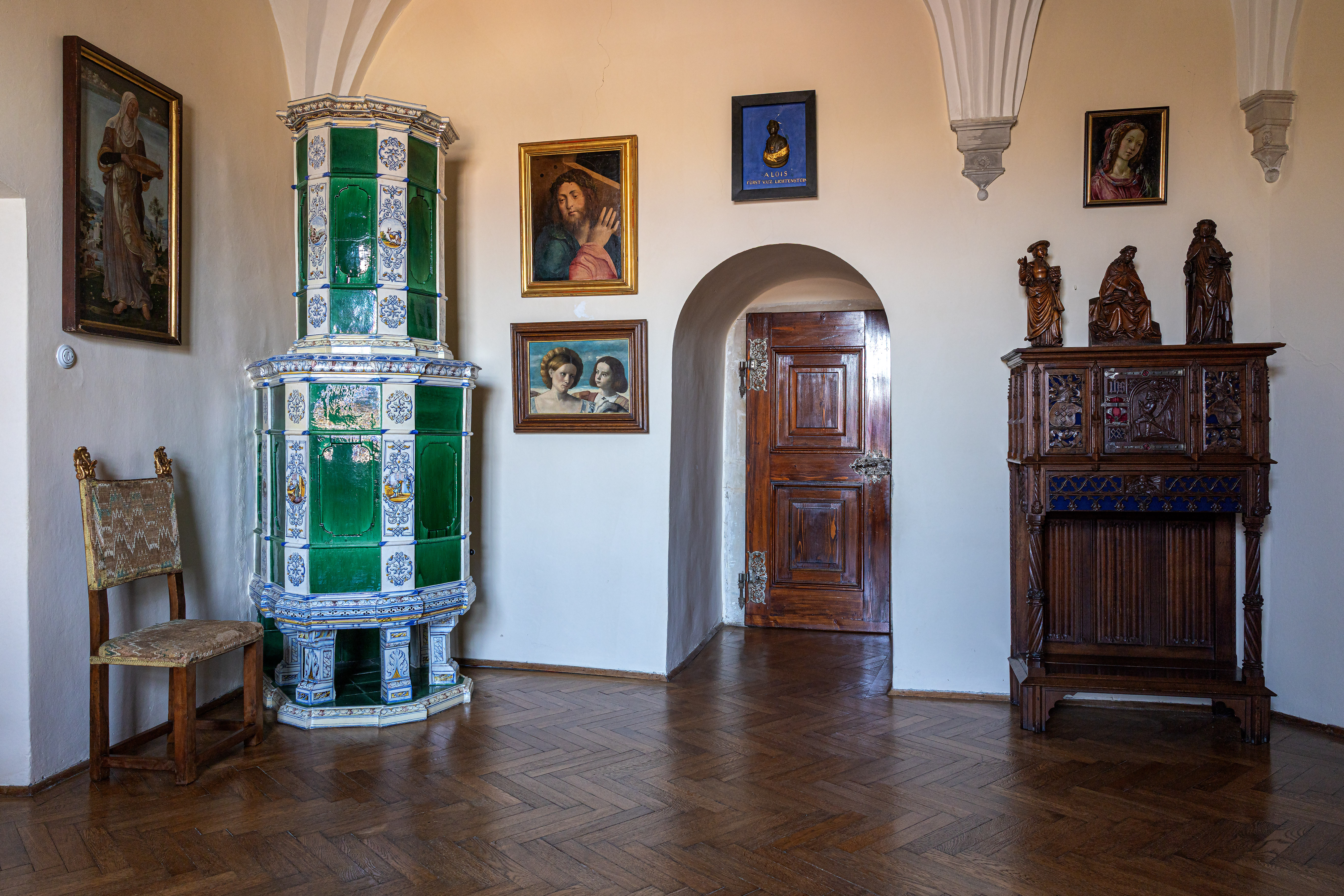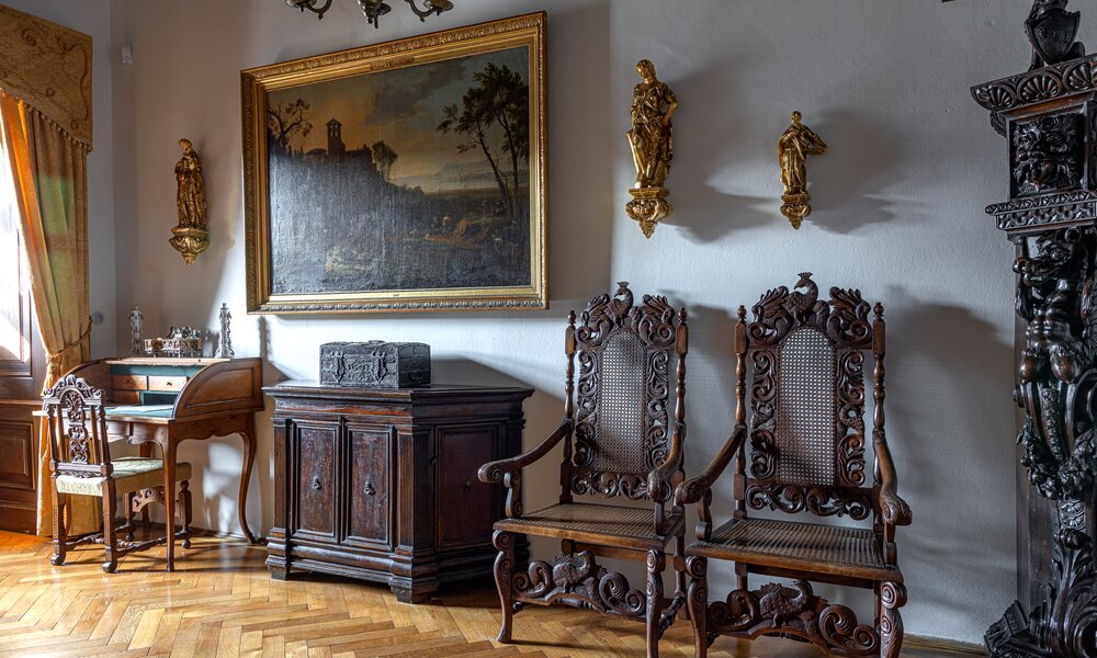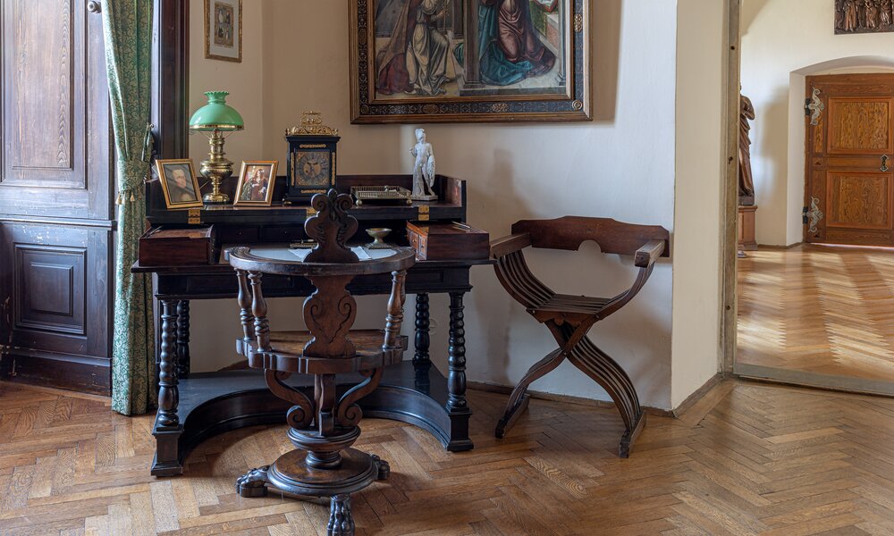 Główna trasa zwiedzania obejmuje reprezentacyjne (gotyckie i renesansowe) wnętrza pierwszego piętra, w których eksponowana jest sztuka europejska z kolekcji księcia Johanna II von und zu Liechtenstein. Obejmuje kaplicę, korytarz i pomieszczenia na pierwszym piętrze wyposażone w meble ostatnich właścicieli. Czas trwania wizyty ok. 60 minut. Wycieczka obejmuje również wizytę w zrekonstruowanej kuchni Liechtensteinu. Dostęp bez barier – możliwość zwiedzania również dla osób na wózkach inwalidzkich.