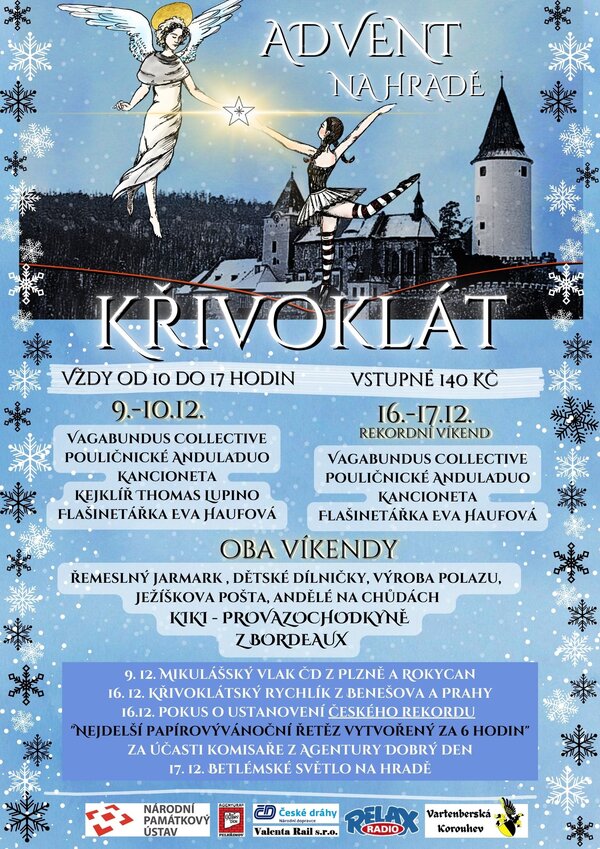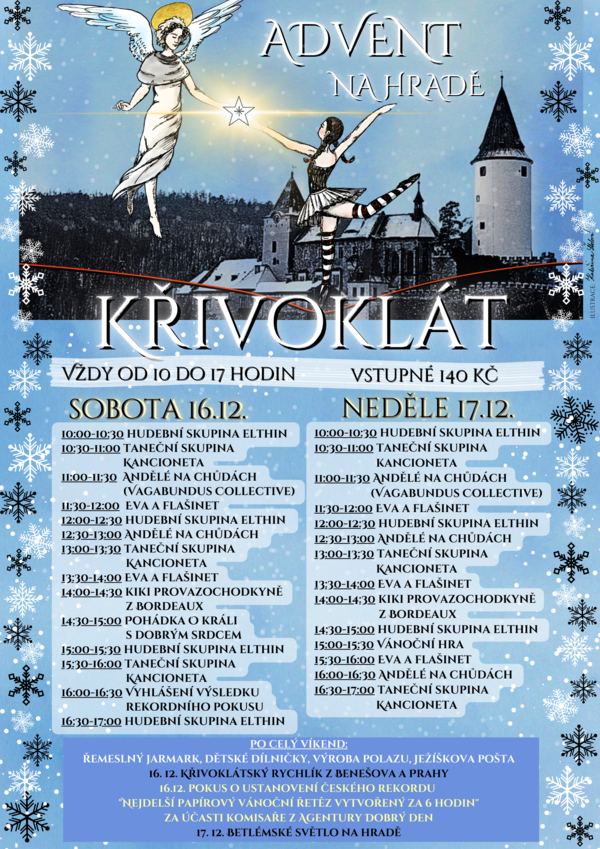 Po oba víkendy se děti zabaví (nejen) výrobou tradičního polazu a budou moci odeslat dopis Ježíškovi přímo z křivoklátské Ježíškovy pošty. V sobotu 16. prosince se všichni návštěvníci mohou zapojit do vytvoření nového českého rekordu "Nejdelší papírový vánoční řetěz vytvořený za 6 hodin" pod bedlivým dohledem komisaře z agentury Dobrý den. A kdo by si chtěl z Křivoklátu odnést pravé a nefalšované betlémské světlo, bude mít příležitost po celou neděli 17. prosince.