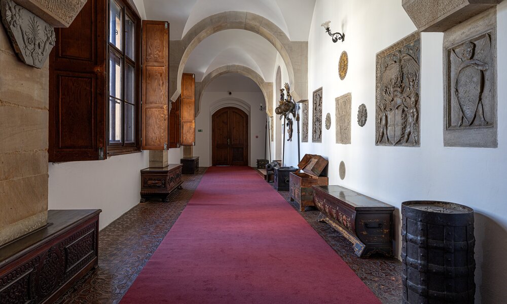 Główna trasa zwiedzania obejmuje reprezentacyjne (gotyckie i renesansowe) wnętrza pierwszego piętra, w których eksponowana jest sztuka europejska z kolekcji księcia Johanna II von und zu Liechtenstein. Obejmuje kaplicę, korytarz i pomieszczenia na pierwszym piętrze wyposażone w meble ostatnich właścicieli. Czas trwania wizyty ok. 60 minut. Wycieczka obejmuje również wizytę w zrekonstruowanej kuchni Liechtensteinu. Dostęp bez barier – możliwość zwiedzania również dla osób na wózkach inwalidzkich.